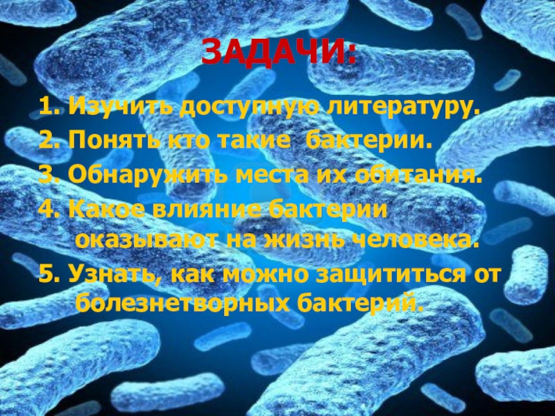 ЗАДАЧИ:1. Изучить доступную литературу.2. Понять кто такие бактерии.3. Обнаружить места их обитания.4. Какое влияние бактерии оказывают на