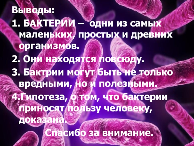 Выводы: 1. БАКТЕРИИ –  одни из самых маленьких, простых и древних  организмов.2. Они находятся повсюду.3. Бактрии могут