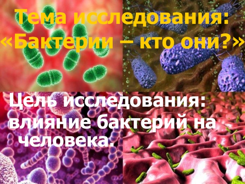 Тема исследования: «Бактерии – кто они?»Цель исследования: влияние бактерий на человека.