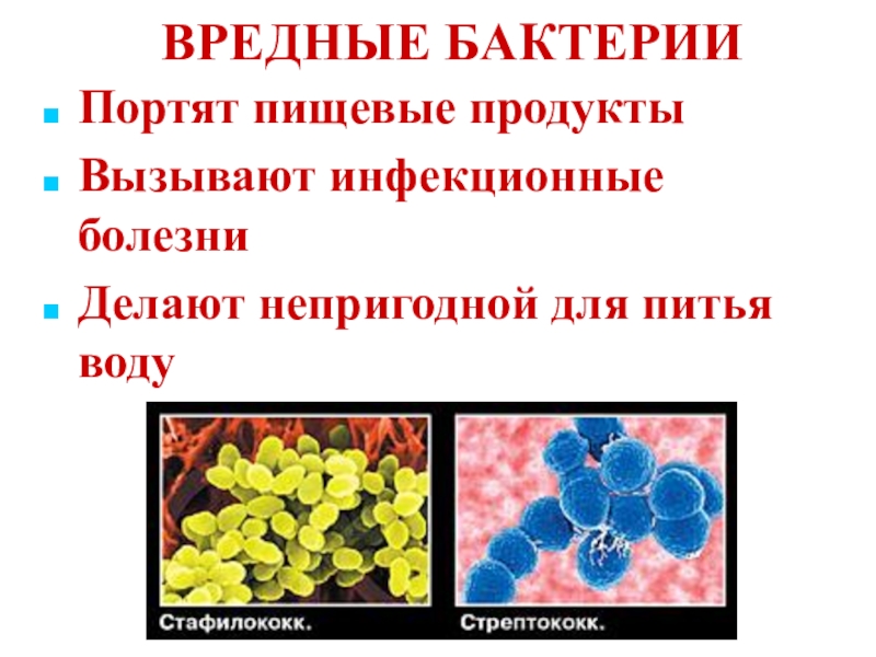 ВРЕДНЫЕ БАКТЕРИИПортят пищевые продуктыВызывают инфекционные болезниДелают непригодной для питья воду
