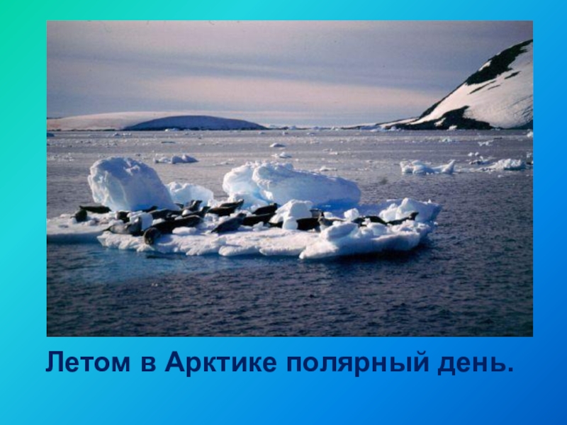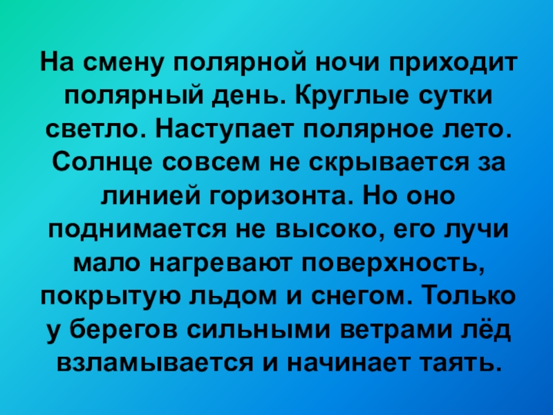 Слайд 22На смену полярной ночи приходит полярный день. Круглые сутки светло. Наступает