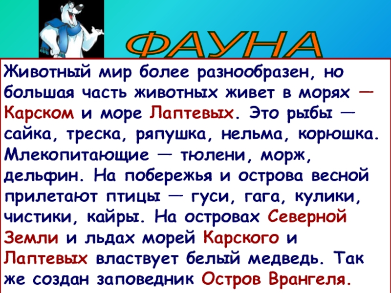 морях — Карском и море Лаптевых. Это рыбы — сайка, треска, ряпушка, нельма, корюшка. Млекопитающие — тюлени, морж, дельфин. На побережья и острова весной прилетают птицы — гуси, гага, кулики, чистики, кайры. На островах Северной Земли и льдах морей Карского и Лаптевых властвует белый медведь. Так же создан заповедник Остров Врангеля.