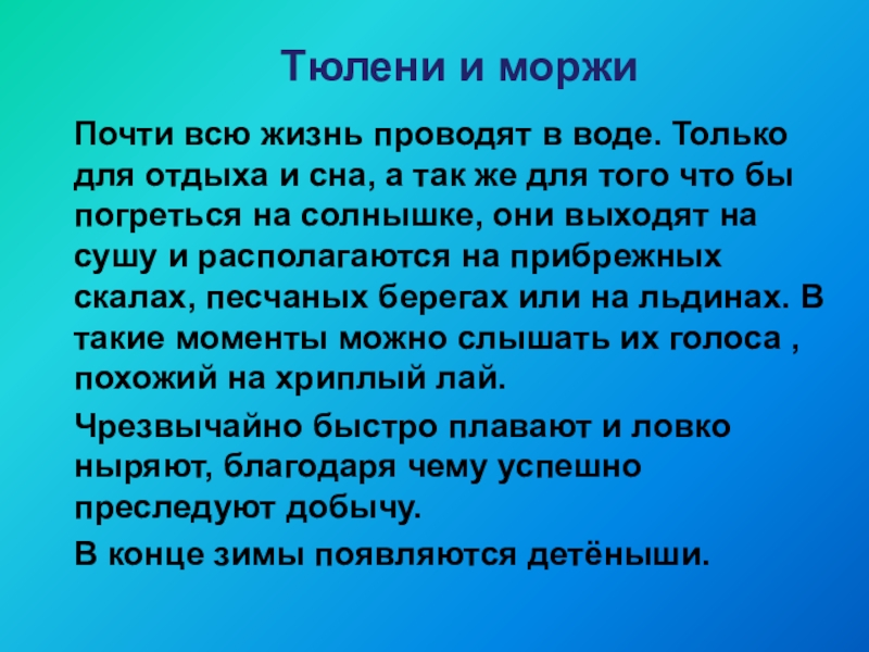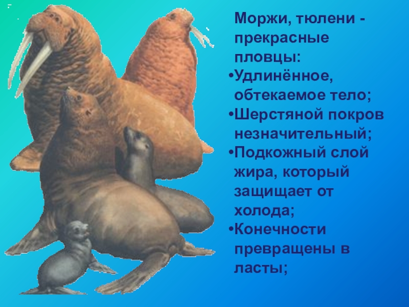Слайд 69Моржи, тюлени -прекрасные пловцы: