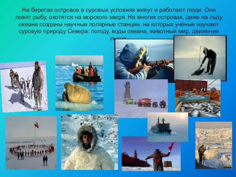 ловят рыбу, охотятся на морского зверя. На многих островах, даже на льду океана созданы научные полярные станции, на которых учёные изучают суровую природу Севера: погоду, воды океана, животный мир, движение льдов.