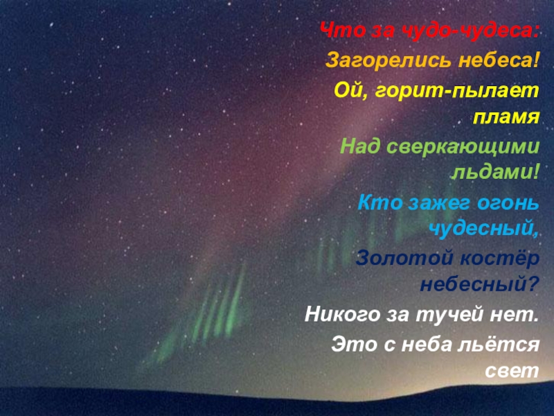 не показывается над линией горизонта. Длится полярная ночь. Только свет звёзд да луны, а иногда полярного сияния освещает бескрайние снежные просторы.