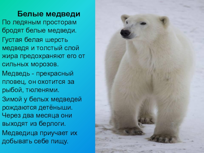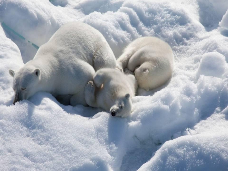 Зимой у белых медведей рождаются детёныши. Через два месяца они выходят из берлоги.