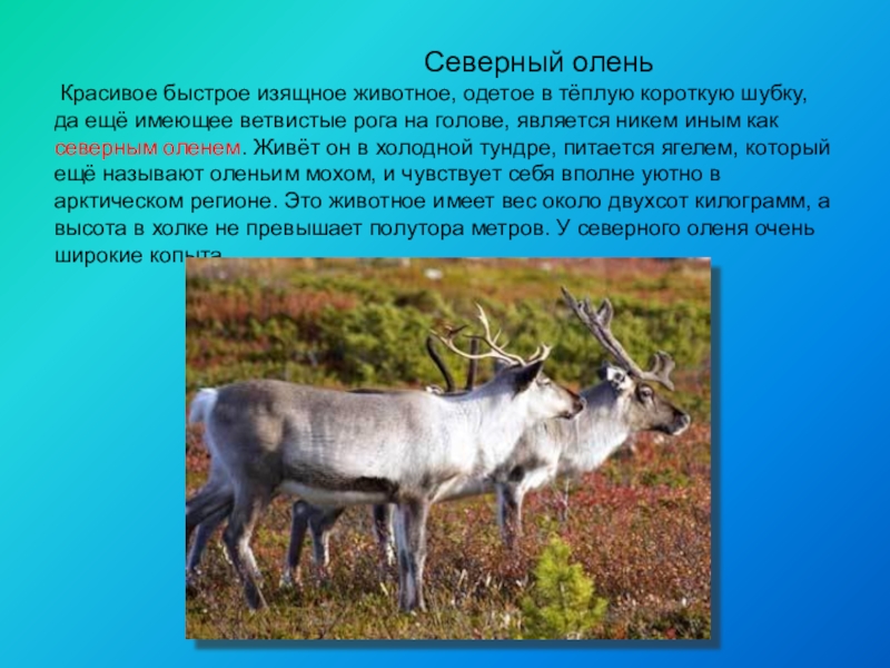 Красивое быстрое изящное животное, одетое в тёплую короткую шубку, да ещё имеющее ветвистые рога на голове, является никем иным как северным оленем. Живёт он в холодной тундре, питается ягелем, который ещё называют оленьим мохом, и чувствует себя вполне уютно в арктическом регионе. Это животное имеет вес около двухсот килограмм, а высота в холке не превышает полутора метров. У северного оленя очень широкие копыта.