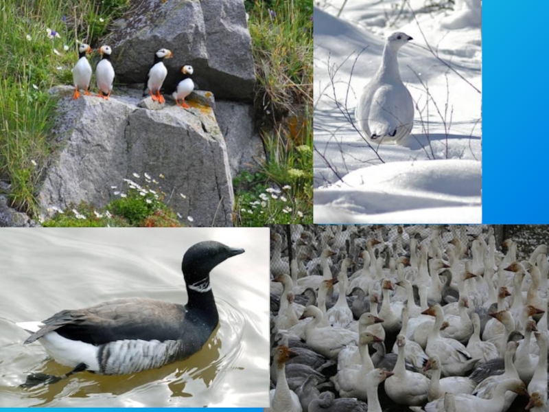 птиц — полярная сова, белая куропатка. Обилие водоёмов сюда привлекает в летнее время: уток, гусей, куликов. В прибрежных районах обитают чайки, гагары, чистики, кайры