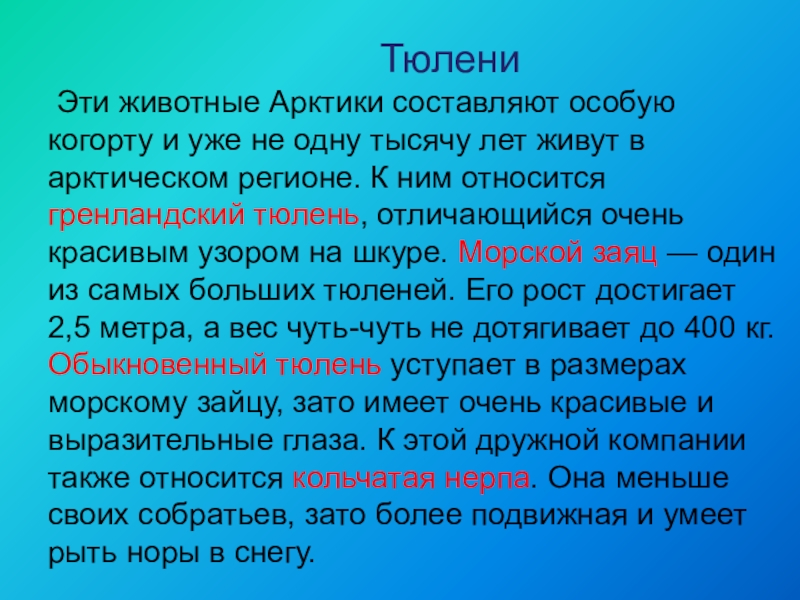 Эти животные Арктики составляют особую когорту и уже не одну тысячу лет живут в арктическом регионе. К ним относится гренландский тюлень, отличающийся очень красивым узором на шкуре. Морской заяц — один из самых больших тюленей. Его рост достигает 2,5 метра, а вес чуть-чуть не дотягивает до 400 кг. Обыкновенный тюлень уступает в размерах морскому зайцу, зато имеет очень красивые и выразительные глаза. К этой дружной компании также относится кольчатая нерпа. Она меньше своих собратьев, зато более подвижная и умеет рыть норы в снегу.
