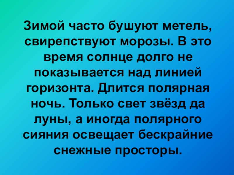 Слайд 16Зимой часто бушуют метель, свирепствуют морозы. В это время солнце долго