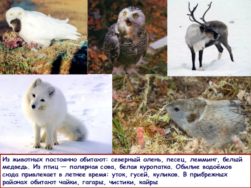 Слайд 80Из животных постоянно обитают: северный олень, песец, лемминг, белый медведь. Из