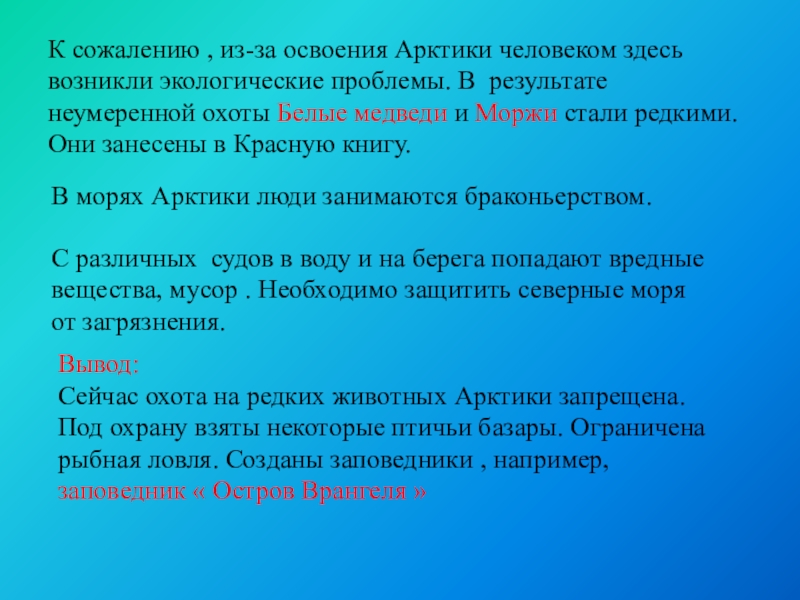 Сейчас охота на редких животных Арктики запрещена. Под охрану взяты некоторые птичьи базары. Ограничена рыбная ловля. Созданы заповедники , например, заповедник « Остров Врангеля »