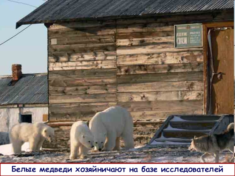 Слайд 73Белые медведи хозяйничают на базе исследователей