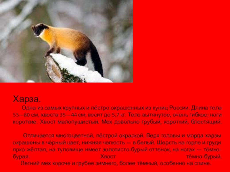куниц России. Длина тела 55—80 см, хвоста 35—44 см; весит до 5,7 кг. Тело вытянутое, очень гибкое; ноги короткие. Хвост малопушистый. Мех довольно грубый, короткий, блестящий.