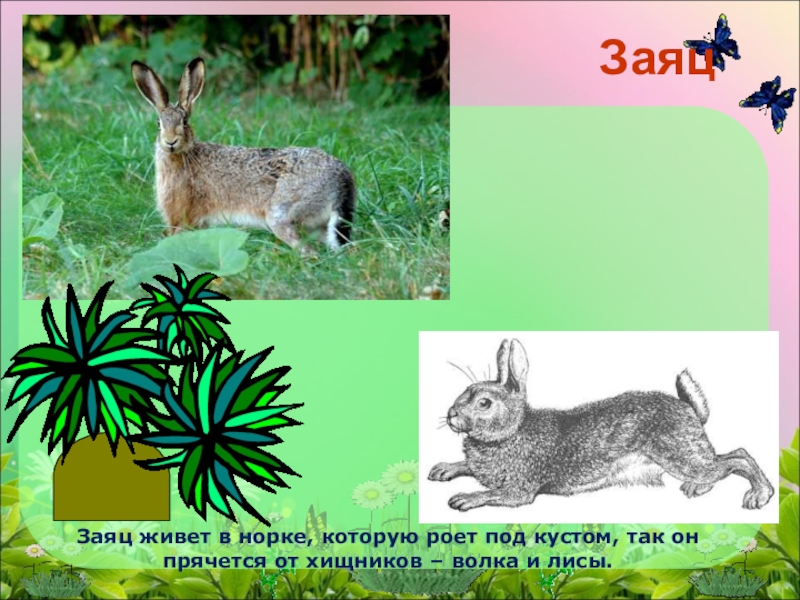 ЗаяцЗаяц живет в норке, которую роет под кустом, так он прячется от хищников – волка и лисы.