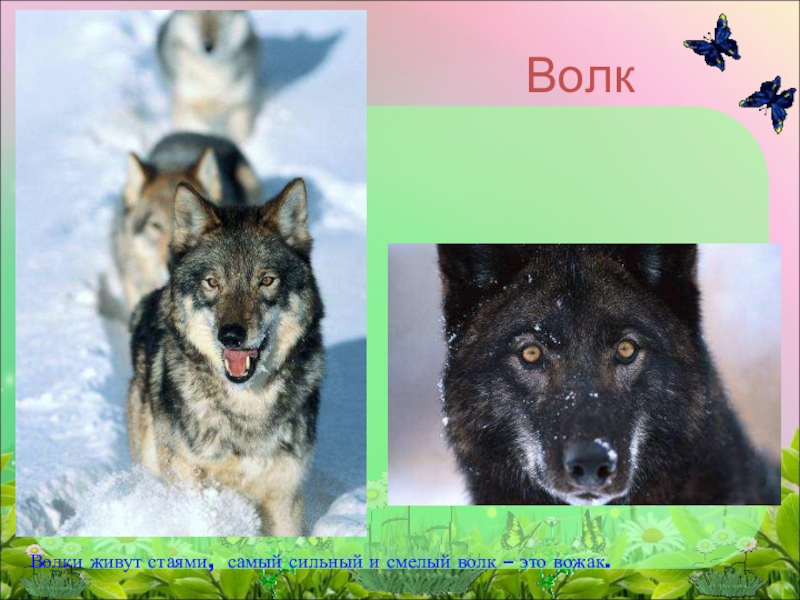 ВолкВолки живут стаями, самый сильный и смелый волк – это вожак.