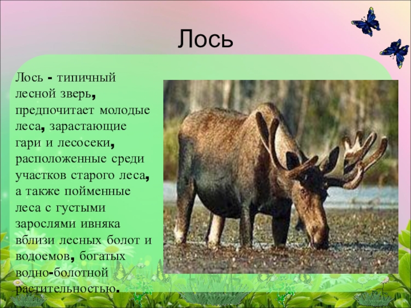 Лось Лось - типичный лесной зверь, предпочитает молодые леса, зарастающие гари и лесосеки, расположенные среди участков старого леса,