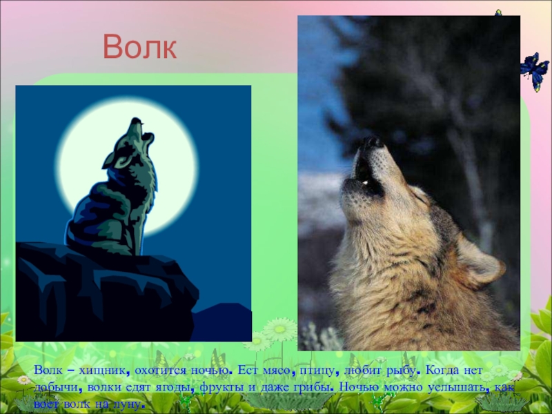 ВолкВолк – хищник, охотится ночью. Ест мясо, птицу, любит рыбу. Когда нет добычи, волки едят ягоды, фрукты