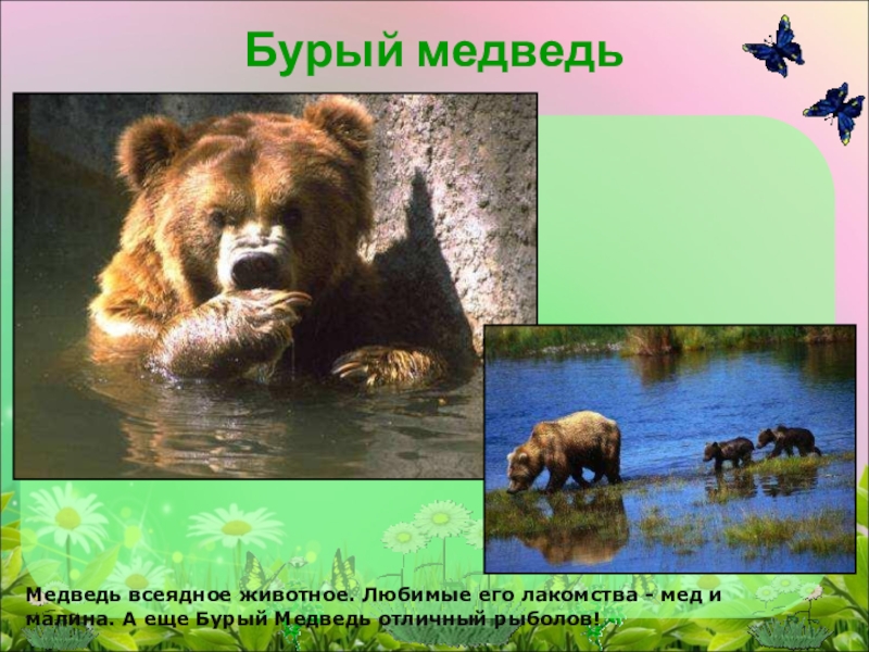 Бурый медведьМедведь всеядное животное. Любимые его лакомства - мед и малина. А еще Бурый Медведь отличный рыболов!