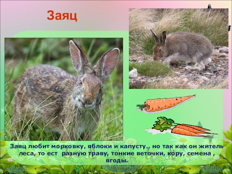 Заяц любит морковку, яблоки и капусту., но так как он житель