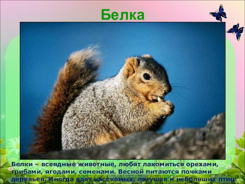 БелкаБелки – всеядные животные, любят лакомиться орехами, грибами, ягодами, семенами. Весной питаются почками деревьев. Иногда едят насекомых,
