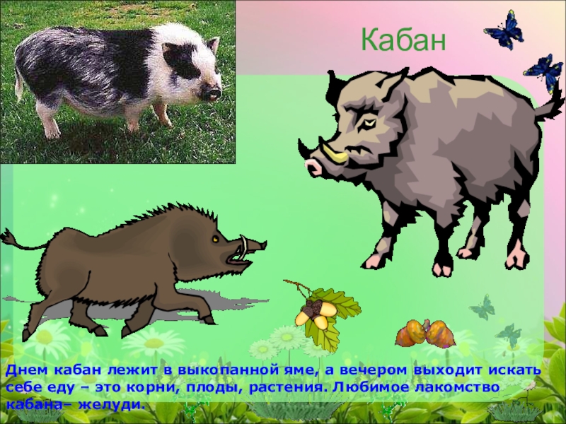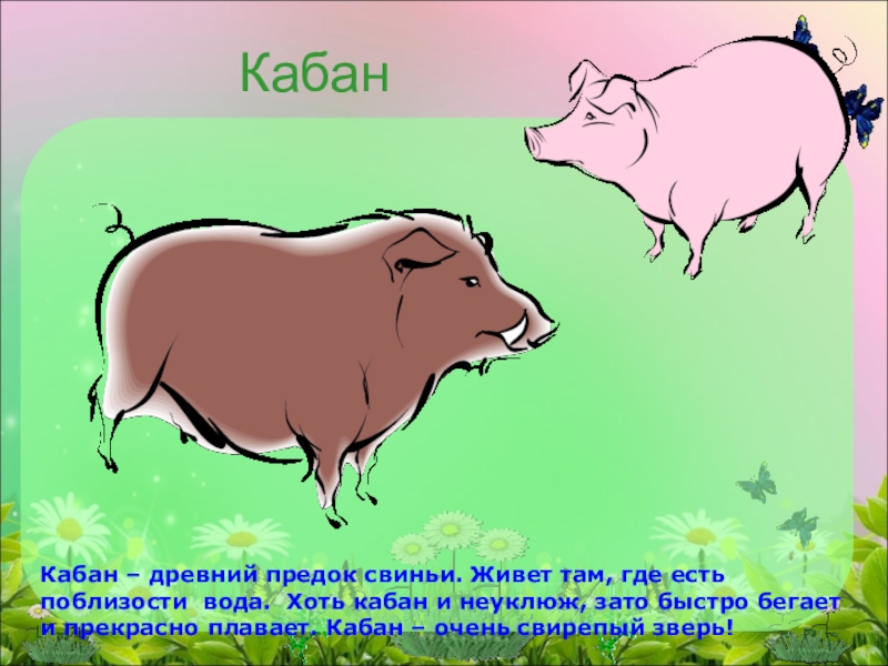 КабанКабан – древний предок свиньи. Живет там, где есть поблизости вода. Хоть кабан и неуклюж, зато быстро