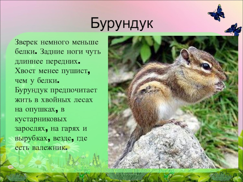 Бурундук Зверек немного меньше белки. Задние ноги чуть длиннее передних. Хвост менее пушист, чем у белки.Бурундук предпочитает жить