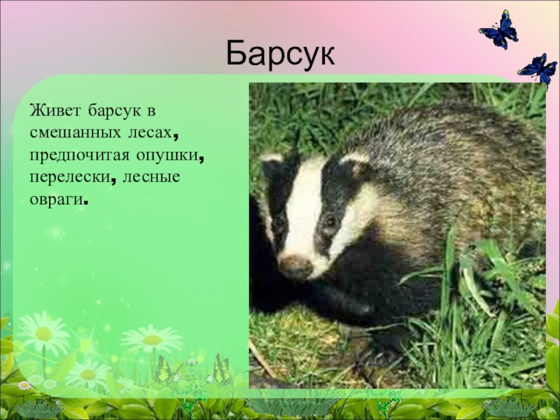 Барсук Живет барсук в смешанных лесах, предпочитая опушки, перелески, лесные овраги.