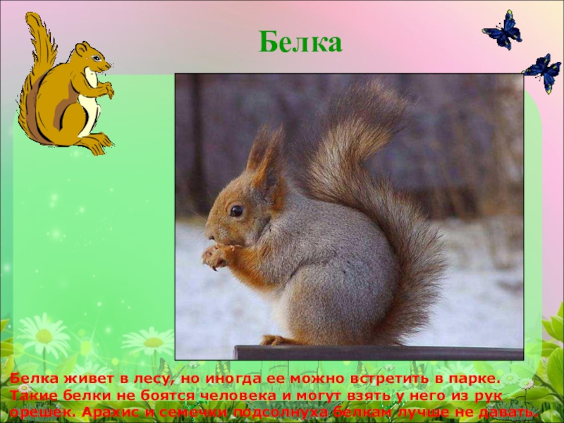 БелкаБелка живет в лесу, но иногда ее можно встретить в парке. Такие белки не боятся человека и