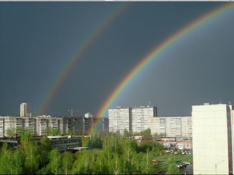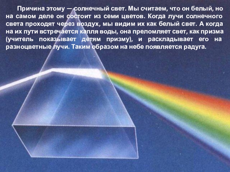 на самом деле он состоит из семи цветов. Когда лучи солнечного света проходят через воздух, мы видим их как белый свет. А когда на их пути встречается капля воды, она преломляет свет, как призма (учитель показывает детям призму), и раскладывает его на разноцветные лучи. Таким образом на небе появляется радуга.