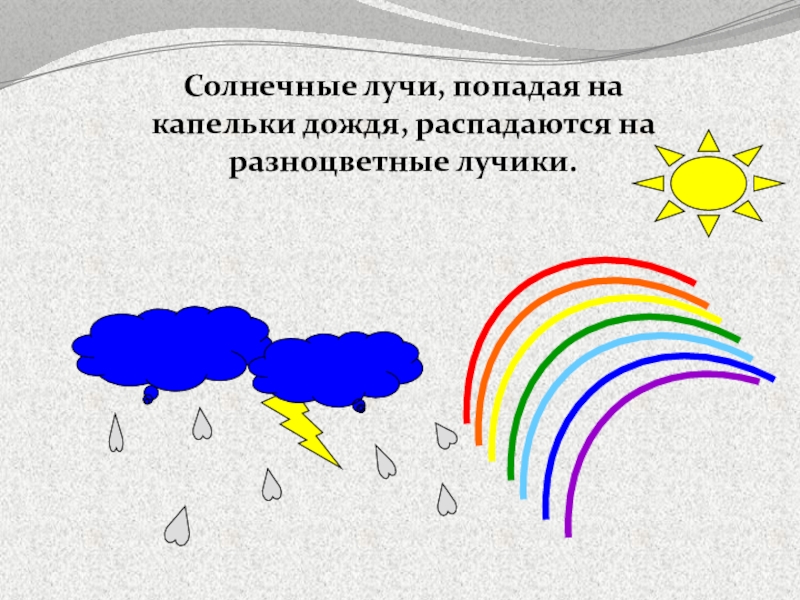 Слайд 8Солнечные лучи, попадая на капельки дождя, распадаются на разноцветные лучики.