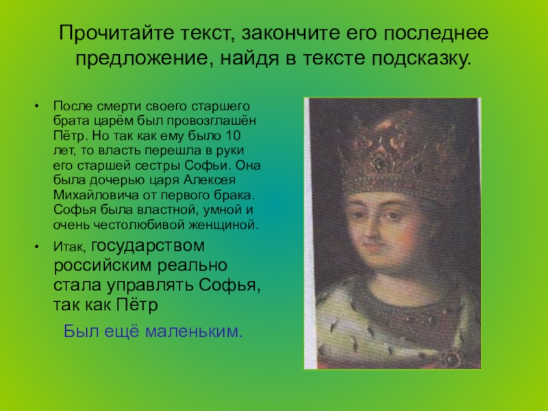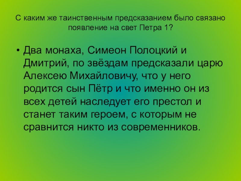 Два монаха, Симеон Полоцкий и Дмитрий, по звёздам предсказали царю Алексею Михайловичу, что у него родится сын Пётр и что именно он из всех детей наследует его престол и станет таким героем, с которым не сравнится никто из современников.