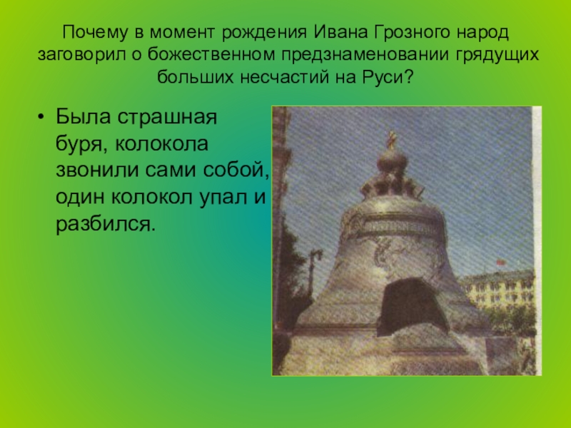 Была страшная буря, колокола звонили сами собой, один колокол упал и разбился.