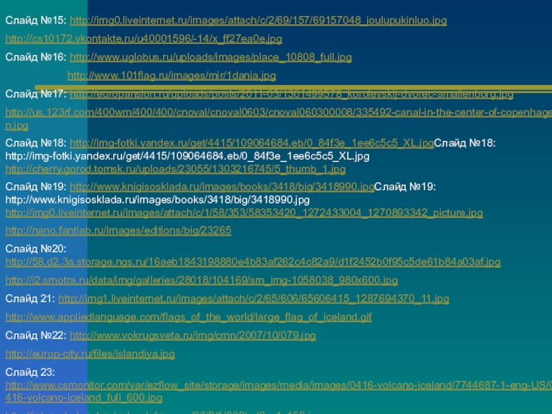 Слайд №15: http://img0.liveinternet.ru/images/attach/c/2/69/157/69157048_joulupukinluo.jpghttp://cs10172.vkontakte.ru/u40001596/-14/x_ff27ea0e.jpg Слайд №16: http://www.uglobus.ru/uploads/images/place_10808_full.jpg           http://www.101flag.ru/images/mir/1dania.jpg