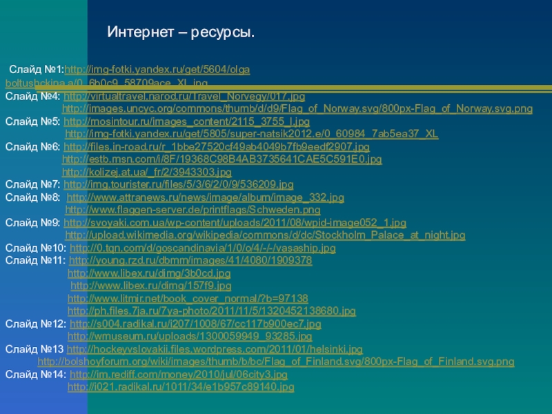 Слайд №1:http://img-fotki.yandex.ru/get/5604/olgaboltushckina.a/0_6b0c9_58709ace_XL.jpg Слайд №4: http://virtualtravel.narod.ru/Travel_Norvegy/017.jpg          http://images.uncyc.org/commons/thumb/d/d9/Flag_of_Norway.svg/800px-Flag_of_Norway.svg.png Слайд