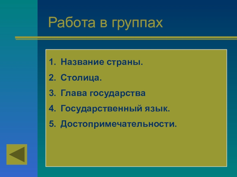 Работа в группахНазвание страны.Столица.Глава государстваГосударственный язык.Достопримечательности.