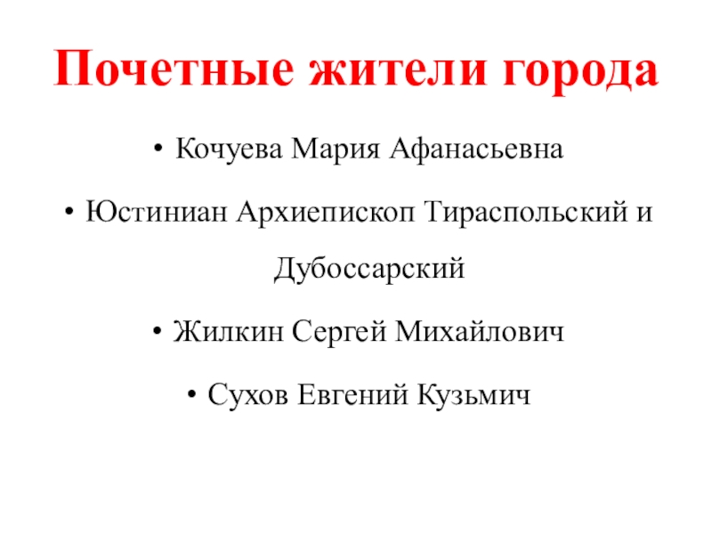 Почетные жители городаКочуева Мария АфанасьевнаЮстиниан Архиепископ Тираспольский и ДубоссарскийЖилкин Сергей МихайловичСухов Евгений Кузьмич
