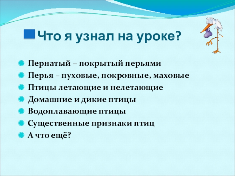 Что я узнал на уроке?Пернатый – покрытый перьямиПерья – пуховые, покровные, маховыеПтицы летающие и нелетающиеДомашние и дикие