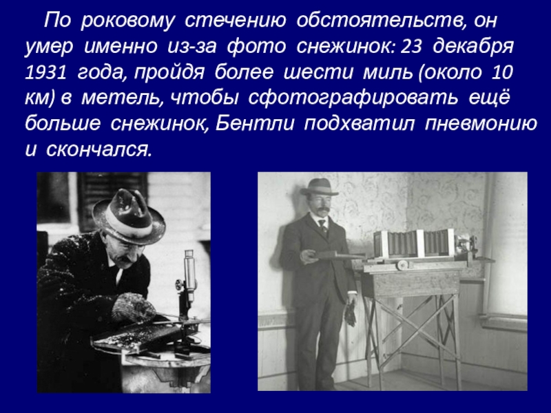 снежинок: 23 декабря 1931 года, пройдя более шести миль (около 10 км) в метель, чтобы сфотографировать ещё больше снежинок, Бентли подхватил пневмонию и скончался.