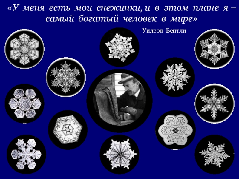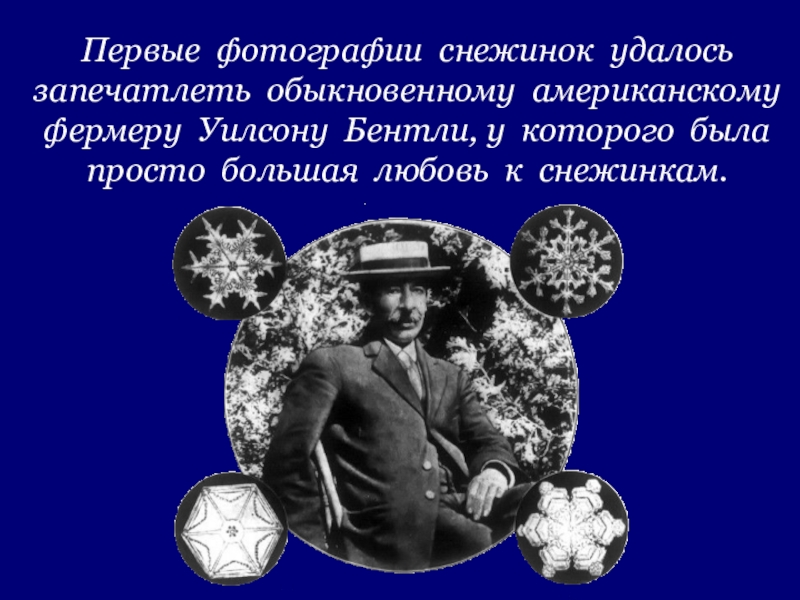 Слайд 9Первые фотографии снежинок удалось запечатлеть обыкновенному американскому фермеру Уилсону Бентли, у