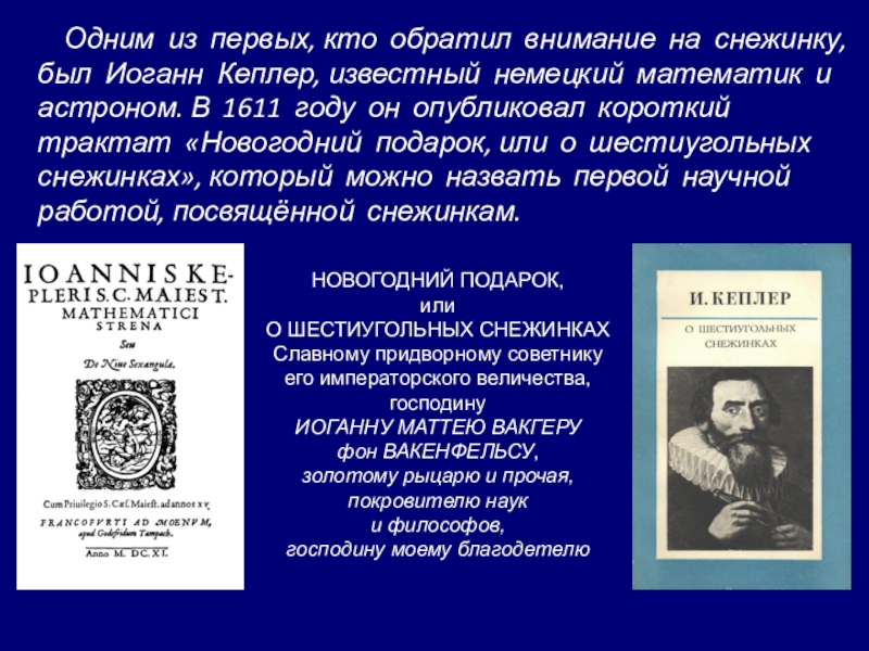Иоганн Кеплер, известный немецкий математик и астроном. В 1611 году он опубликовал короткий трактат «Новогодний подарок, или о шестиугольных снежинках», который можно назвать первой научной работой, посвящённой снежинкам.