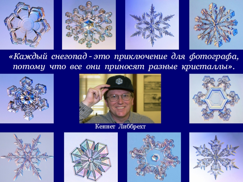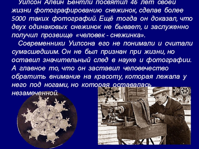 снежинок, сделав более 5000 таких фотографий. Ещё тогда он доказал, что двух одинаковых снежинок не бывает, и заслуженно получил прозвище «человек - снежинка».