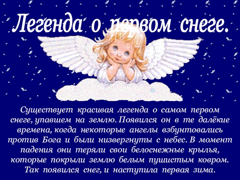 Слайд 2Существует красивая легенда о самом первом снеге, упавшем на землю. Появился