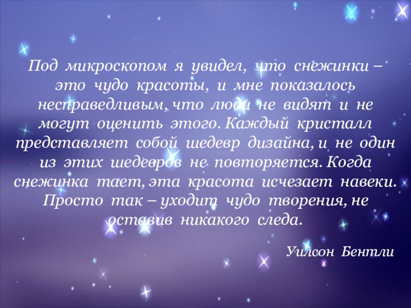 Слайд 31Под микроскопом я увидел, что снежинки – это чудо красоты, и