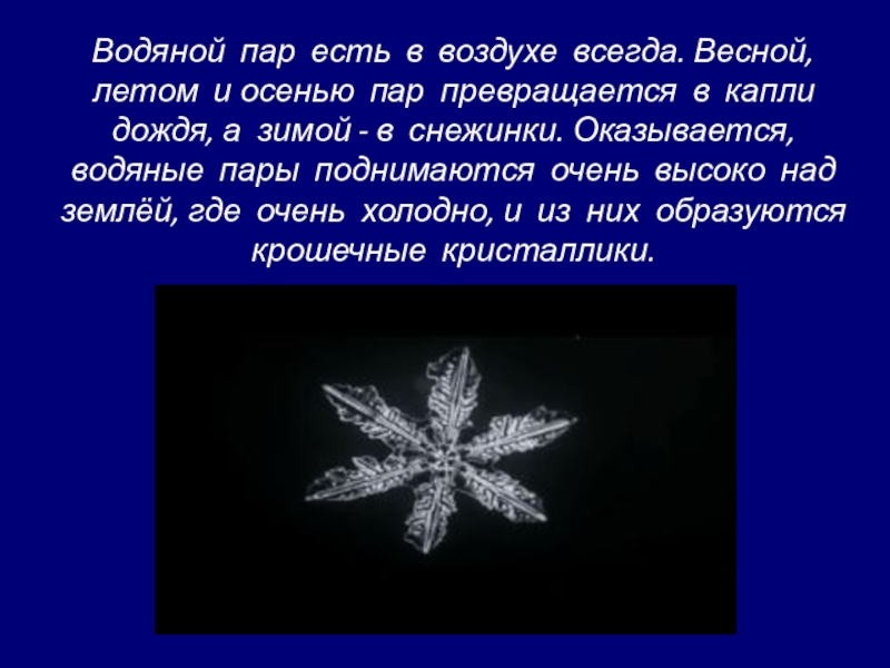 превращается в капли дождя, а зимой - в снежинки. Оказывается, водяные пары поднимаются очень высоко над землёй, где очень холодно, и из них образуются крошечные кристаллики.