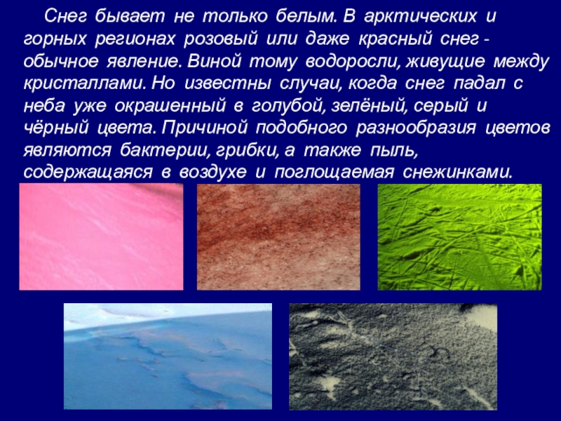 Слайд 28 Снег бывает не только белым. В арктических и горных