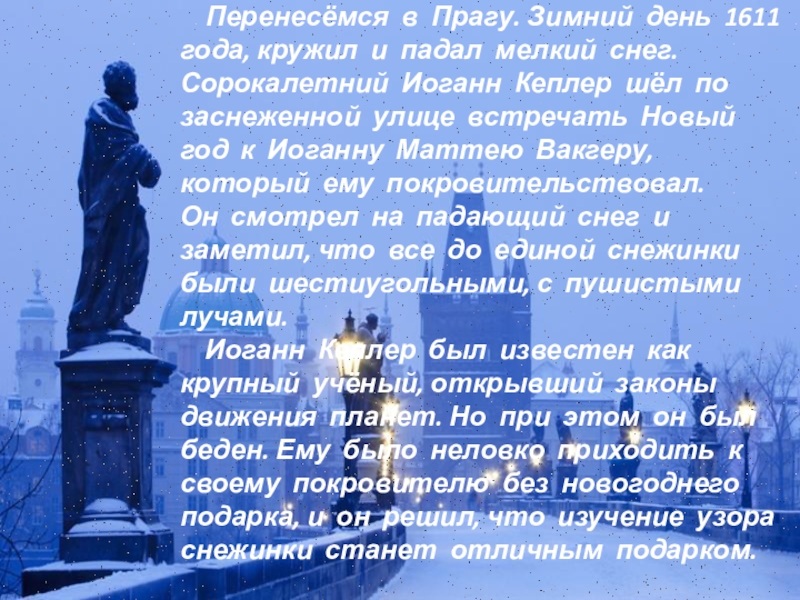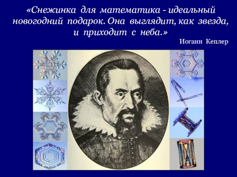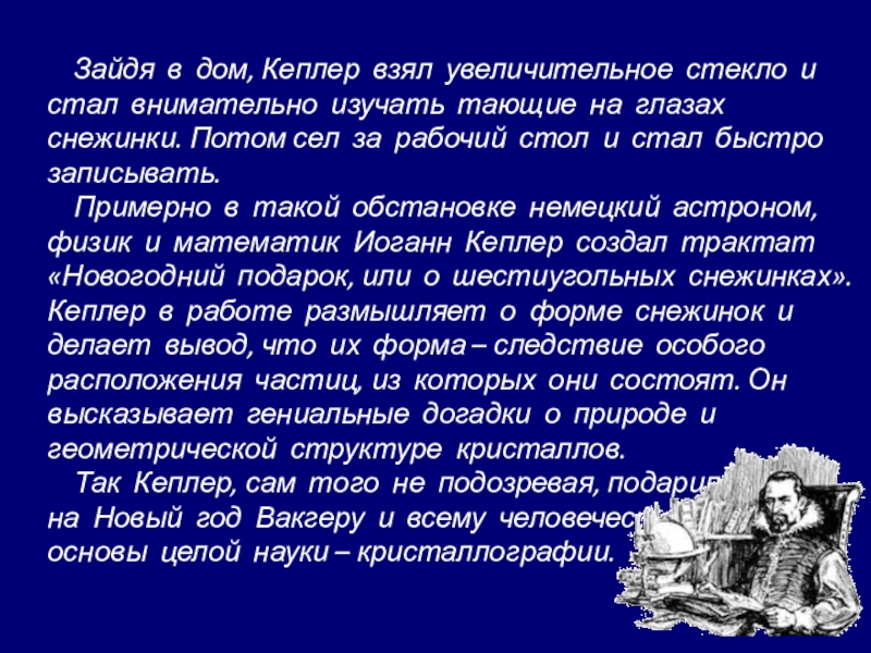 Иоганн Кеплер был известен как крупный учёный, открывший законы движения планет. Но при этом он был беден. Ему было неловко приходить к своему покровителю без новогоднего подарка, и он решил, что изучение узора снежинки станет отличным подарком.