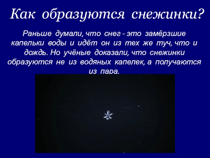 и идёт он из тех же туч, что и дождь. Но учёные доказали, что снежинки образуются не из водяных капелек, а получаются из пара.