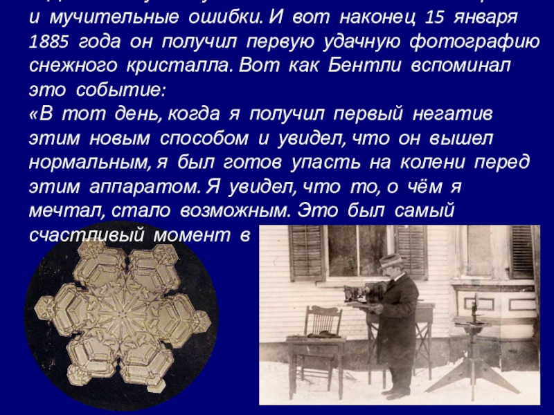 мучительные ошибки. И вот наконец 15 января 1885 года он получил первую удачную фотографию снежного кристалла. Вот как Бентли вспоминал это событие: