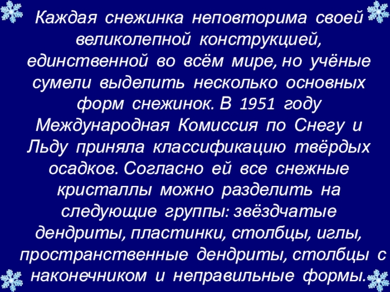 учёные сумели выделить несколько основных форм снежинок. В 1951 году Международная Комиссия по Снегу и Льду приняла классификацию твёрдых осадков. Согласно ей все снежные кристаллы можно разделить на следующие группы: звёздчатые дендриты, пластинки, столбцы, иглы, пространственные дендриты, столбцы с наконечником и неправильные формы.